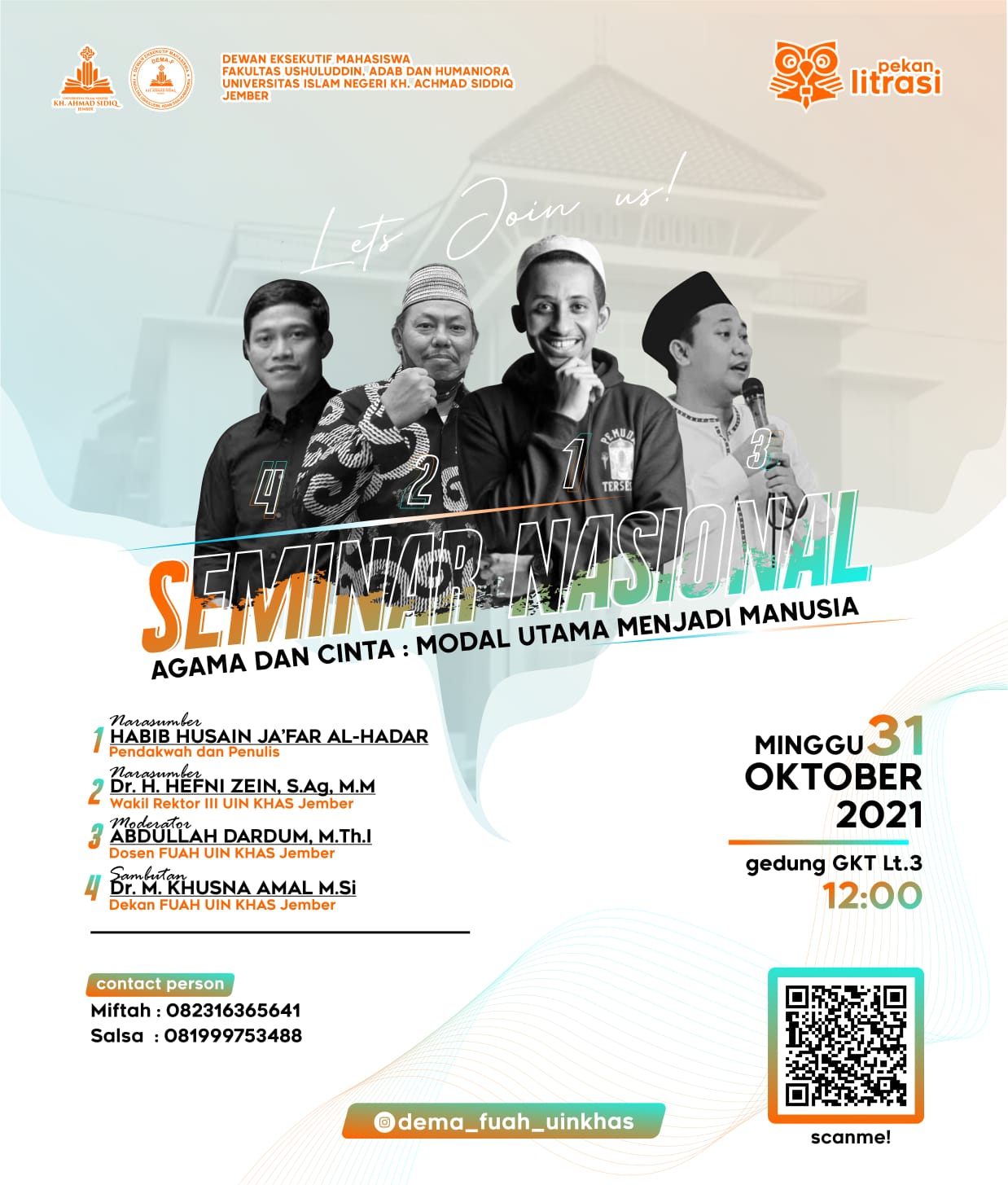 Jember, agitasi.idAgama dan Cinta: Modal Utama Menjadi Manusia. Tulisan yang melatarbelakangi kursi narasumber, cukup menarik perhatian hadirin dengan menerka-nerka kiranya apa relasinya? Dengan menghadirkan dua narasumber, Habib Husain Ja’far Al-Hadar dan Dr. Hefni Zein, memberikan nilai tawar dan ketertarikan tersendiri. Acara yang dilaksanakan oleh DEMA-FUAH kali ini mengundang minat, baik mahasiswa maupun masyarakat secara luas. Faktanya, hadirin pada acara yang dilaksanakan hari minggu 31 Oktober kemarin, mampu menyabet habis kursi yang disediakan.